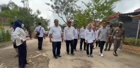 Tidak tinggal diam, dalam kunjungan tersebut Bupati Nina langsung turun dari mobil dan mengecek langsung kondisi jalan rusak tersebut.