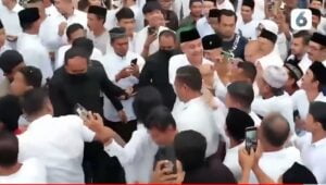 Saat memasuki ke gedung tempat ribuan ulama berkumpul, Ganjar Pranowo disambut lantunan solawat dari ribuan masyarakat. Suasana khidmat pun begitu terasa.