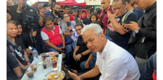 MHNEWS.id.- Sugianti (74), seorang pedagang di Pasar Anyar Bahari di Warakas, Tanjung Priok, Jakarta memberikan wejangan kepada calon presiden (capres) Ganjar Pranowo.