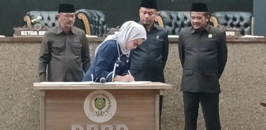 MHNEWS.id.- Bupati Indramayu, Nina Agustina bersama pimpinan DPRD setempat menandatangani persetujuan terhadap Raperda tentang Pajak Daerah (PD) dan Retribusi Daerah (RD).