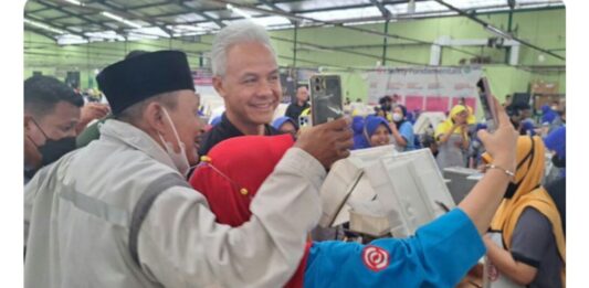 MHNEWS.id.- Calon presiden nomor 3 Ganjar Pranowo disambut meriah para buruh ketika tiba di pabrik rokok. Para buruh yang sedang bekerja pun bersorak ketika Ganjar masuk ke ruangan pabrik.