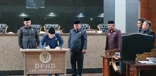 Dokumen persetujuan pun ditandatangani pimpinan DPRD dan Bupati Indramayu, Nina Agustina yang diwakili Sekretaris Daerah, Aep Surahman disaksikan peserta rapat paripurna dan undangan.